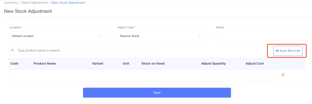 Once you have the barcode managed, when you create a sale order/purchase order/stock adjustment order, you can use the barcode scan feature by clicking the [Sacn Barcode] button.